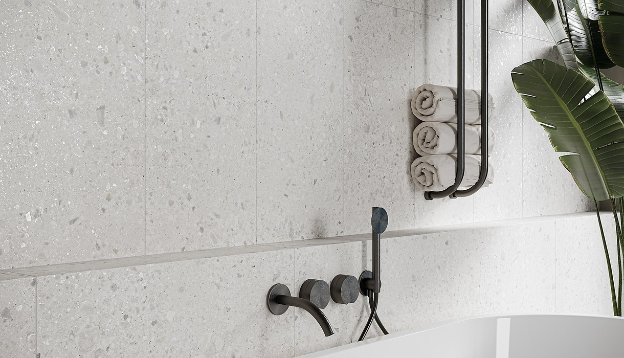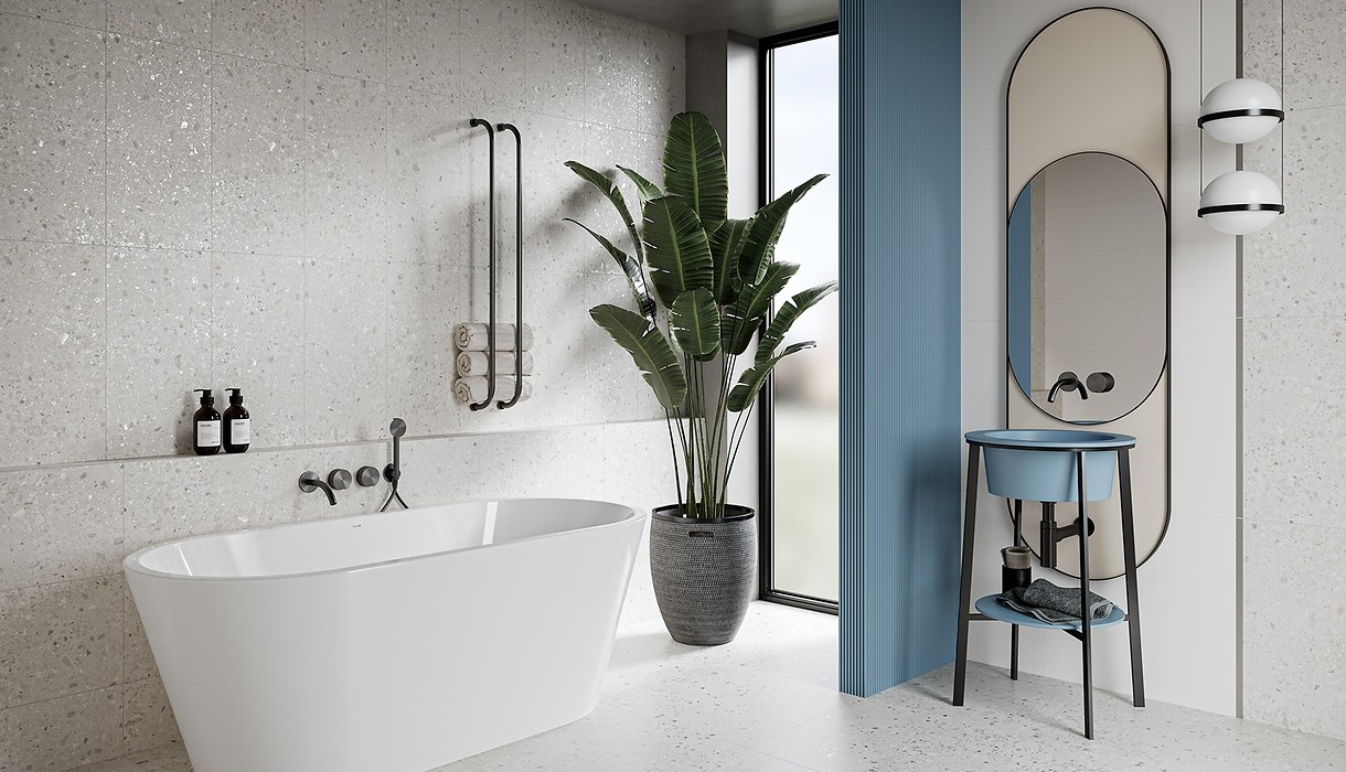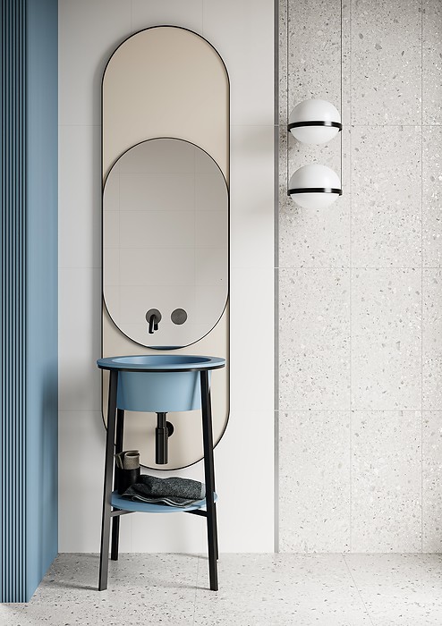 W bazowej grafice kolekcji MEET ME nawiązującej do efektownego terazzo, spotykają się drobne kamyczki różnej wielkości, w stonowanych kolorach o niezwykłej palecie odcieni – od bieli i szarości, do pojedynczych akcentów niebieskiego i beżu. Wzór wypełnia całą powierzchnię płytek wywołując efekt wielowymiarowości i głębi. Bazowa płytka terazzo o satynowym wykończeniu (29,8 × 59,8 cm) oraz płytka gresowa (59,8 × 59,8 cm) o tym samym wzorze, stworzy nowoczesny, zmysłowy efekt wnętrza. Zrównoważy go biała satynowa płytka gładka (29,8 × 59,8 cm) oraz srebrna matowa listwa (2 × 59,8 cm), która położona pionowo dopełni wystrój. Bogactwo wzoru i kolorystyczne akcenty beżu i niebieskiego na płytkach ściennych i podłogowych tworzą doskonałą bazę rozmaitych aranżacji. Kolory są stonowane, dzięki czemu to dodatki zdecydują o tym, jakiego wyrazu nabierze wnętrze. Dzięki przekrojowi barw łazienka z kolekcją MEET ME może zmieniać się w zależności od elementów uzupełniających. Pudrowy róż ociepli wnętrze, błękity i szarości nadadzą mu morskiego lub nowojorskiego klimatu, a piaskowe elementy stworzą naturalny efekt.