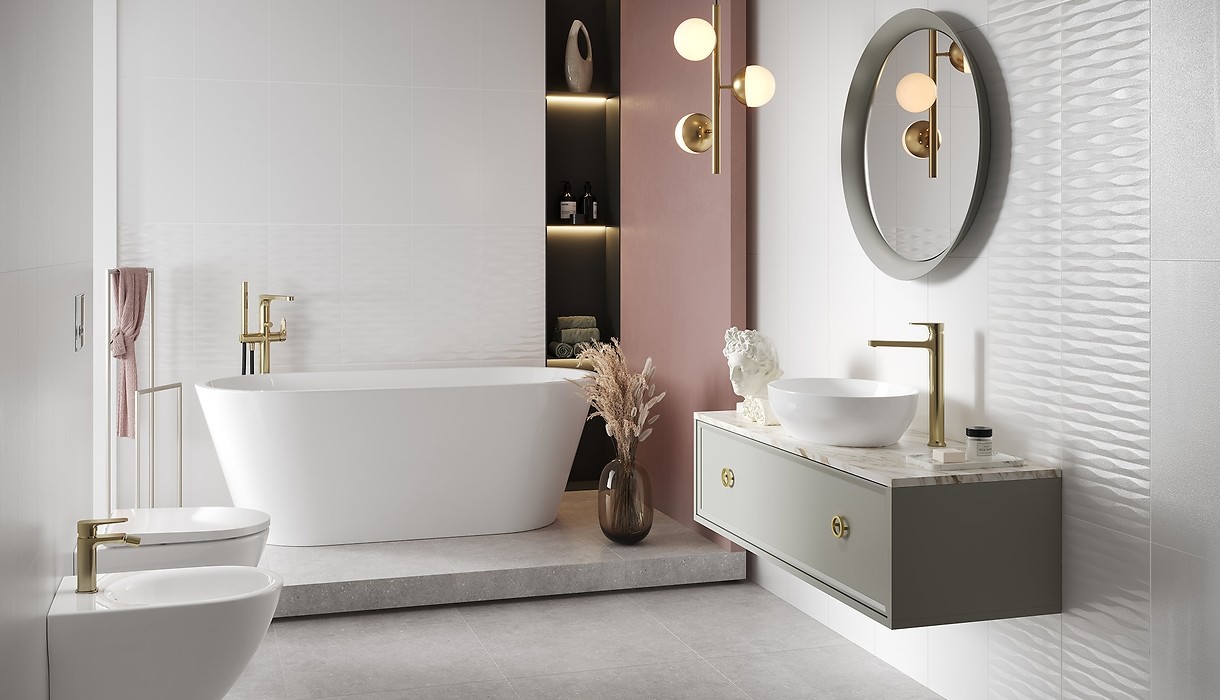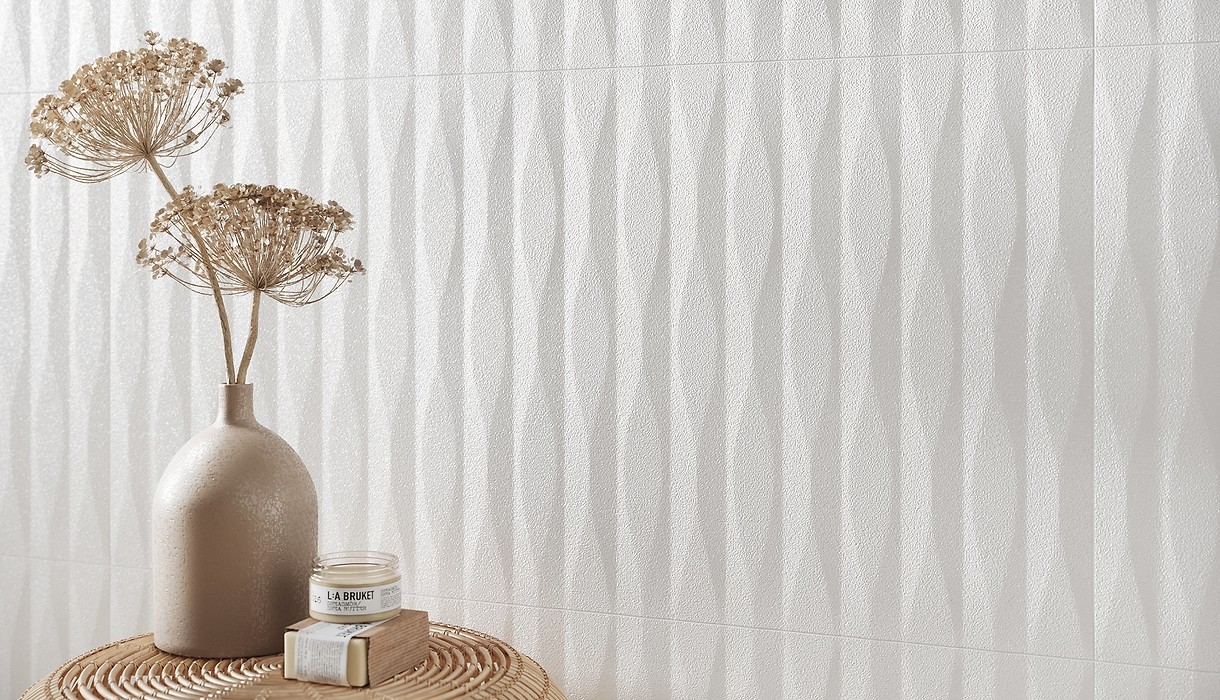 Kolekcja OPOCZNO PARMINA wyróżnia się wyjątkową powierzchnią płytek. Zastosowana mikrogranilia nadaje intrygujący efekt zmrożonej, oszronionej powierzchni. W kolekcji dostępne są dwie płytki w formacie 29,8×59,8 cm: gładka biała oraz strukturalna. Płytka strukturalna o falistym wzorze mieni się i skrzy pod wpływem światła, płytka gładka delikatnie ją tonuje. Kolekcję uzupełnia i  ociepla płytka gresowa Classic Oak White Matt Rect o wzorze jasnego drewna w formacie deski 14,7×89 cm oraz srebrna połyskująca listwa o wymiarach 1×59,8 cm. Kolekcja PARMINA jest niezwykle plastyczna. Kolorystyka bieli przyprószonej śnieżnym szronem daje wiele możliwości aranżacyjnych. W  połączeniu z  szarością betonu, złotymi dodatkami i  elementami pudrowego różu stworzy efekt w  stylu glamour. Z  podłogą z  płytek drewnopodobnych o  perfekcyjnym jasnym wzorze drewna i  naturalnymi dodatkami, nada pomieszczeniu charakteru boho. Z czarną armaturą i nowoczesnym lustrem – uzyskamy łazienkę w stylu modern.