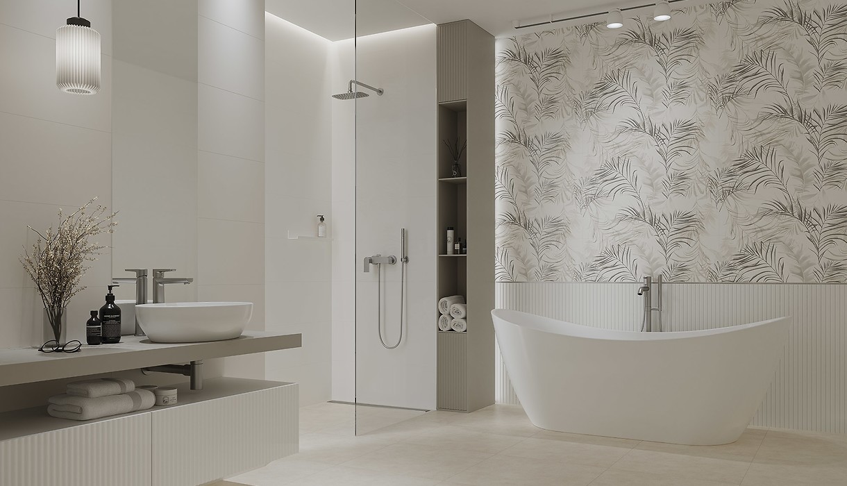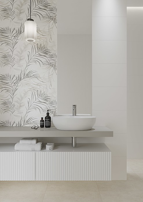 SOFTY LEAVES to kolekcja płytek, która zdołała uchwycić piękno natury i  zaprezentowała jej urok w neutralnych odcieniach szarości. Ozdobne liście, ożywione przez delikatny wiatr, zostały utrwalone na jasnym tle. Satynowa, gładka powierzchnia płytki delikatnie rozprasza światło, dodając wnętrzu głębi i elegancji, a nowoczesny, kojący motyw wprowadza spokój i harmonię. Jako akcent dekoracyjny liściasty wzór przyciąga uwagę i wzbogaca każdą przestrzeń. Idealnie komponuje się z  gładką, białą płytką oraz białą płytką lamelową. Tworzy też harmonijny efekt w  zestawieniu z  płytkami o  grafice delikatnego cementu. Dwuelementowa dekoracja panelowa Softy Leaves, układana obok siebie tworzy kontynuujący się wzór zarówno w pionie, jak i poziomie. Dzięki temu można uzyskać harmonijny efekt na całej ścianie.
